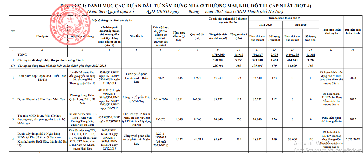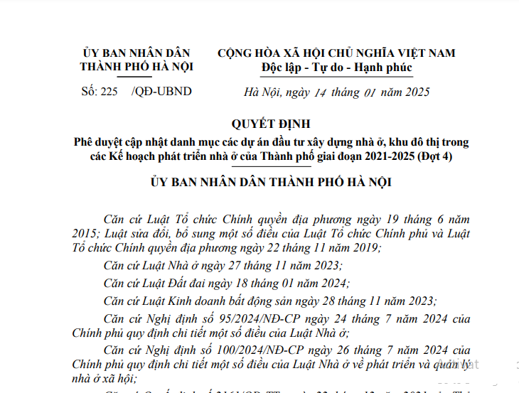 Trước đó, ngày 14/1, Phó Chủ tịch UBND thành phố Hà Nội Dương Đức Tuấn đã ký ban hành Quyết định số 225/QĐ-UBND phê duyệt cập nhật danh mục các dự án đầu tư xây dựng nhà ở, khu đô thị (đợt 4).