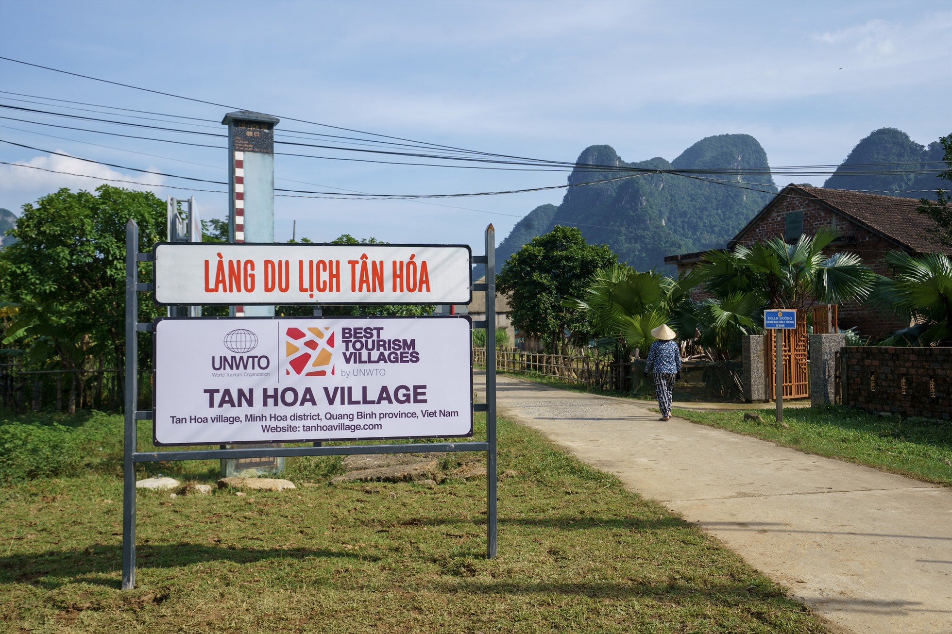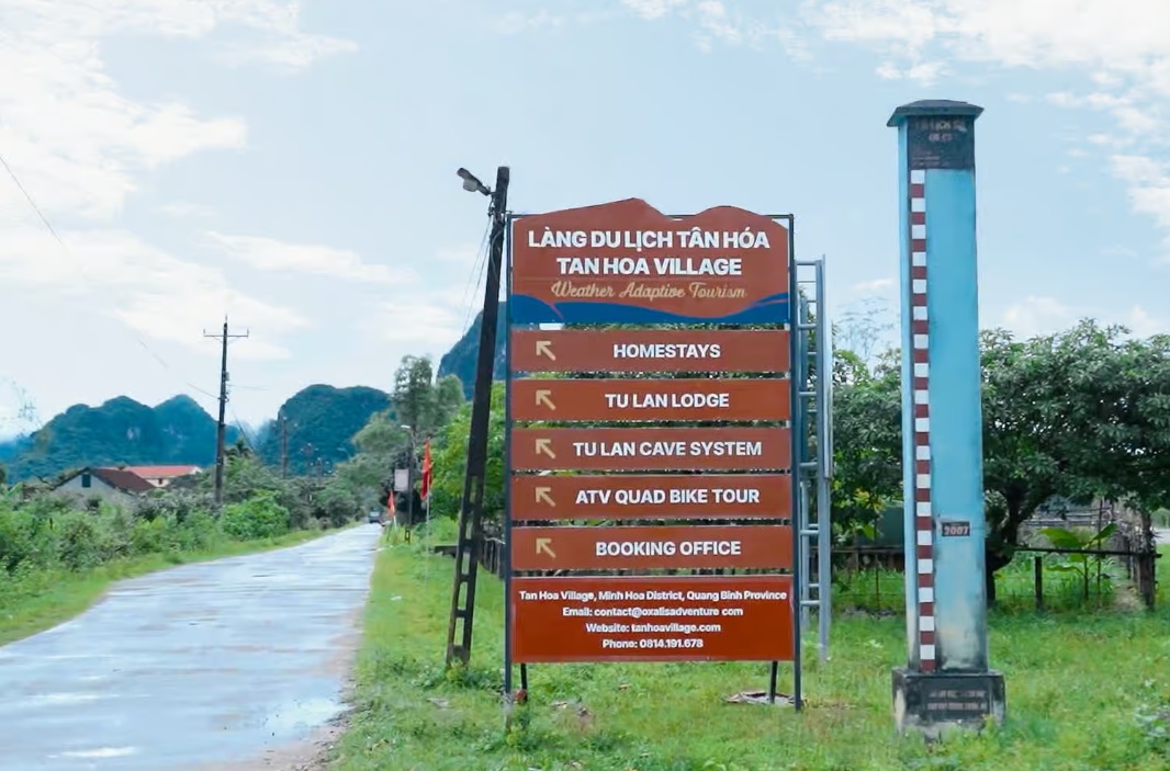 Biển chỉ dẫn vào làng du lịch Tân Hóa được lãnh đạo đại phương cho xây dựng giúp du khách dễ dàng di chuyển