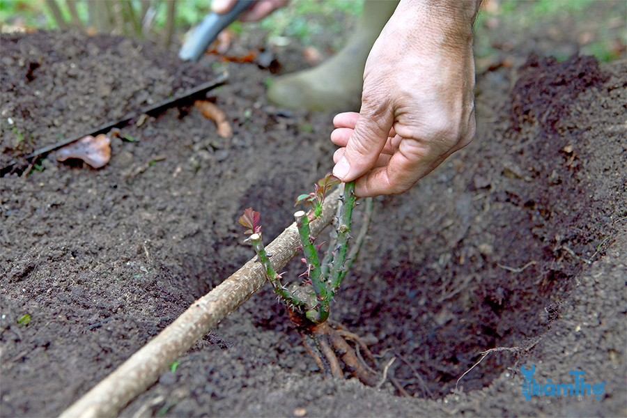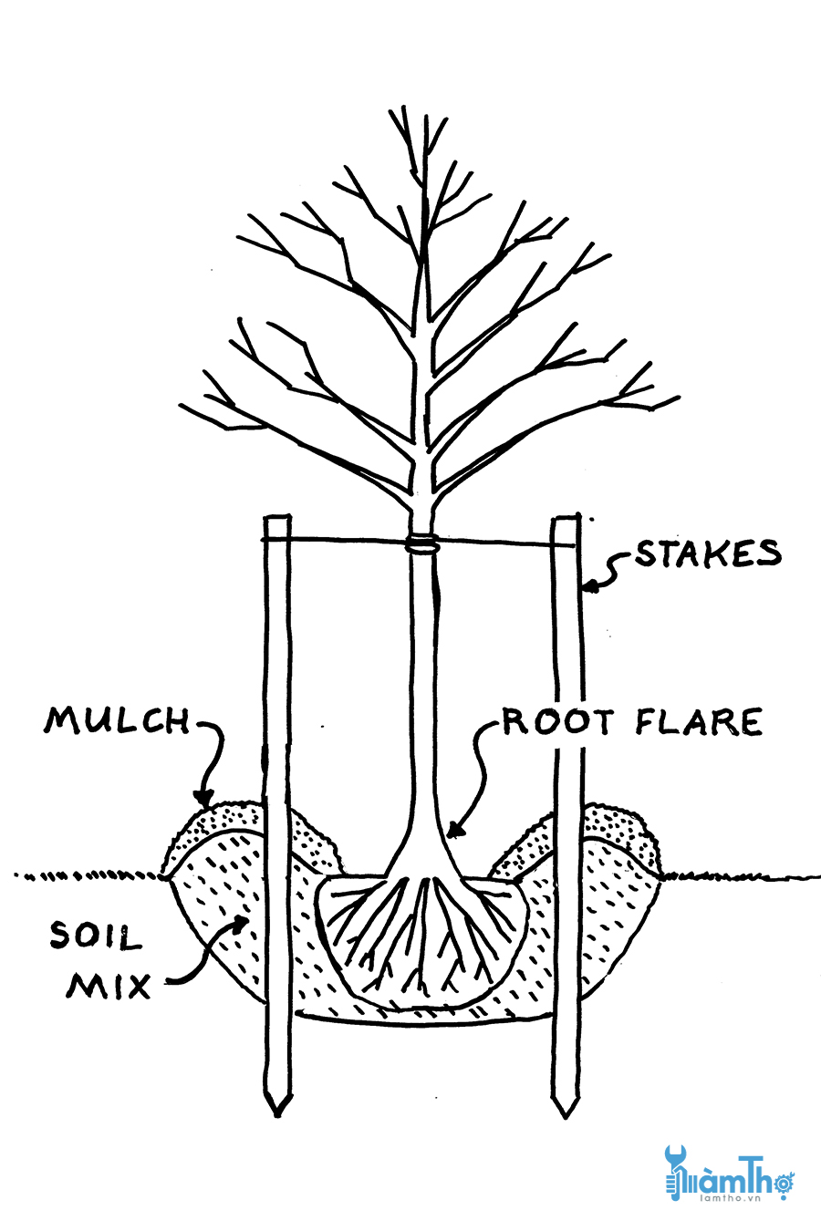 Với cây thân gỗ, phần loe rễ root flare (điểm mà rễ đầu tiên nhú ra khỏi thân) nên được đặt ngang với đất. Điều này đặc biệt cần thiết với cây vì trồng quá sâu là nguyên nhân phổ biến gây chết cây. Nếu không nhìn thấy root flare của cây, hãy bới bớt đất trồng cho đến khi bạn có thể nhìn thấy nó.