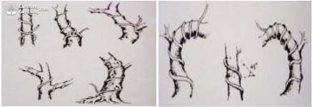 - Tạo tán cổ: Từ một cành chính tạo nhiều nhánh được co kéo và ép thành một tầng nằm ngang. Mặt bông tán thường là hình tròn, phía dưới bằng phẳng, phía trên tạo nhánh dăm cho phát triển lá để có hình mâm xôi; tất cả các bông tán đều phải nằm ngang đồng thời song song với nhau cũng như song song với mặt đất.