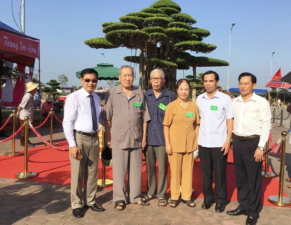 Nghệ nhân sinh vật cảnh Cao Văn Phú (bìa trái) cùng đại biểu tham dự triển lãm
