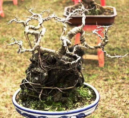 Với phần rễ, một vài người muốn bộ rễ trồi lên tăng thêm sự già dặn thì lúc chúng ta sang chậu mới cho cây thì dùng dây cố định cây ở trên bề mặt chậu rồi bắt đầu uốn các cành, nhánh. Chúng ta moi những rễ chính trồi lên mặt đất, cắt bỏ những rễ con không cần thiết để tập trung nuôi rễ chính. Dùng kẽm chôn một đầu vào trong gốc rồi uốn rễ lan tỏa ra xung quanh sau đó mới lấp đất lại.