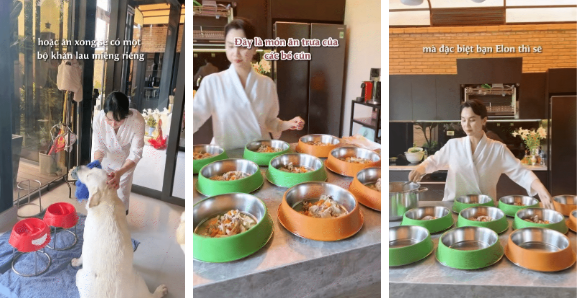 Về lý do chi nhiều tiền đến vậy để chăm sóc chó, Linh Đặng cho biết do 2 vợ chồng đi làm cả ngày, các con thì đi học nên không có thời gian chăm đàn chó. Vậy nên cô phải thuê riêng 2 người để làm việc này. Mỗi ngày họ sẽ chuẩn bị từng bữa ăn, dắt chúng đi dạo và quan tâm theo dõi tình hình sức khỏe của đàn chó. Chia sẻ về đồ ăn cho chó, nữ CEO cho biết cô cực kỳ kỹ tính, mỗi bữa ăn đều được chế biến cần thận, cô cũng mua nhiều loại đồ ăn đóng hộp với các vị khác nhau để đàn cho cưng không bị ngán. Các loại hạt, đồ ăn vặt cho chó, cô mua theo từng bao tải và cất trong các thùng nhựa to bằng thùng đựng gạo. Thậm chí vị phú bà này còn dành nguyên một căn phòng trong nhà, chỉ để đồ ăn dành cho đàn chó cưng của mình.