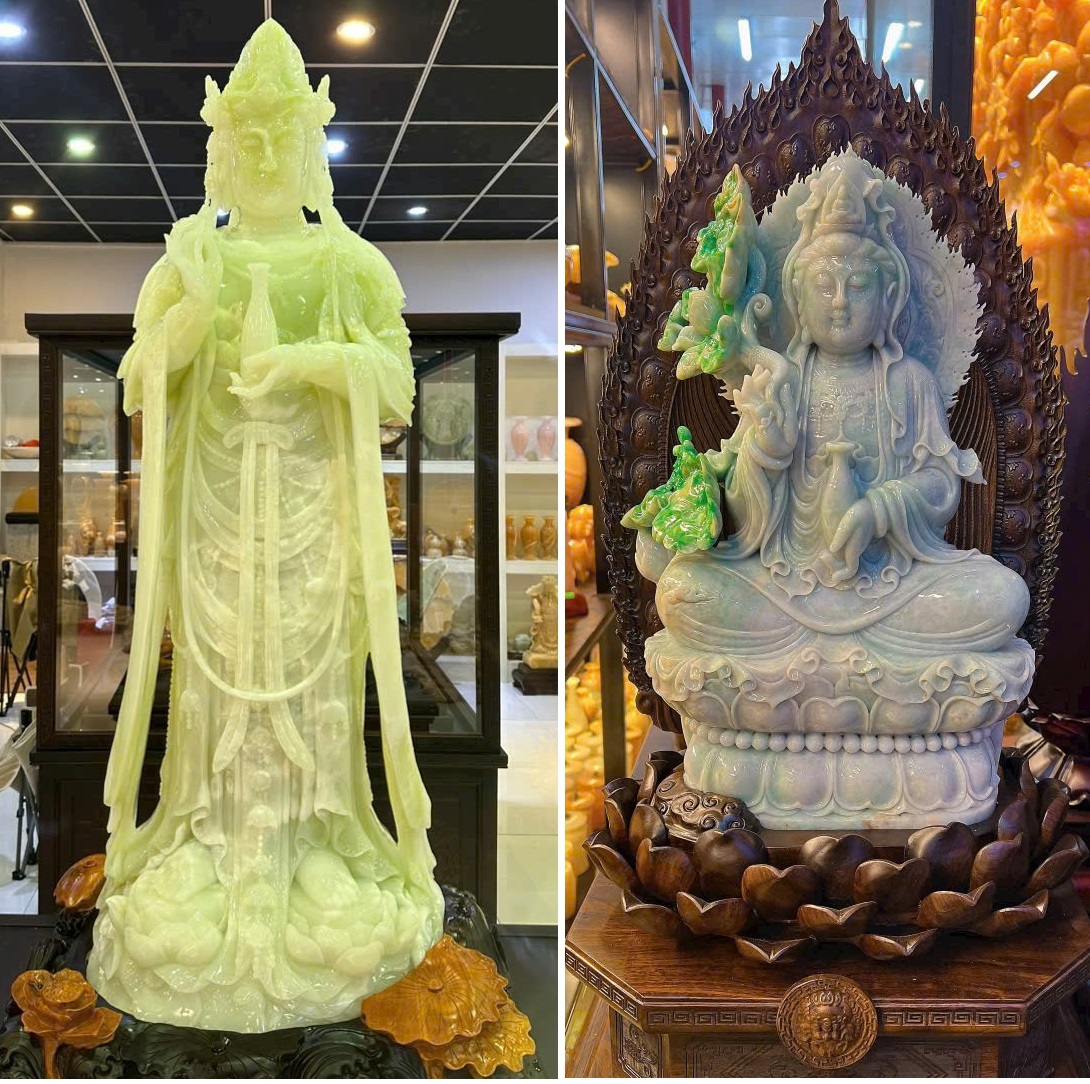 Những dòng ngọc quý được ưa chuộng để chế tác tượng Phật như các sản phẩm Ngọc Hoàng Long là chất liệu mang lại sự quyền quý, tượng trưng cho trí tuệ và sức mạnh tâm linh, thường được lựa chọn để chế tác những pho tượng Phật mang ý nghĩa sâu sắc. Bên cạnh đó, ngọc Onyx với các sắc độ xanh, hồng, trắng lại toát lên vẻ trang nhã, thanh tịnh, giúp mang đến sự an lành cho không gian thờ cúng. Đặc biệt, ngọc Phỉ Thúy – biểu tượng của sự cao quý, phước lành và trường thọ – luôn được giới mộ điệu phong thủy ưa chuộng để tạc tượng Quan Công, Phật Di Lặc, tạo nên những tác phẩm vừa mang giá trị nghệ thuật vừa chứa đựng nguồn năng lượng mạnh mẽ.