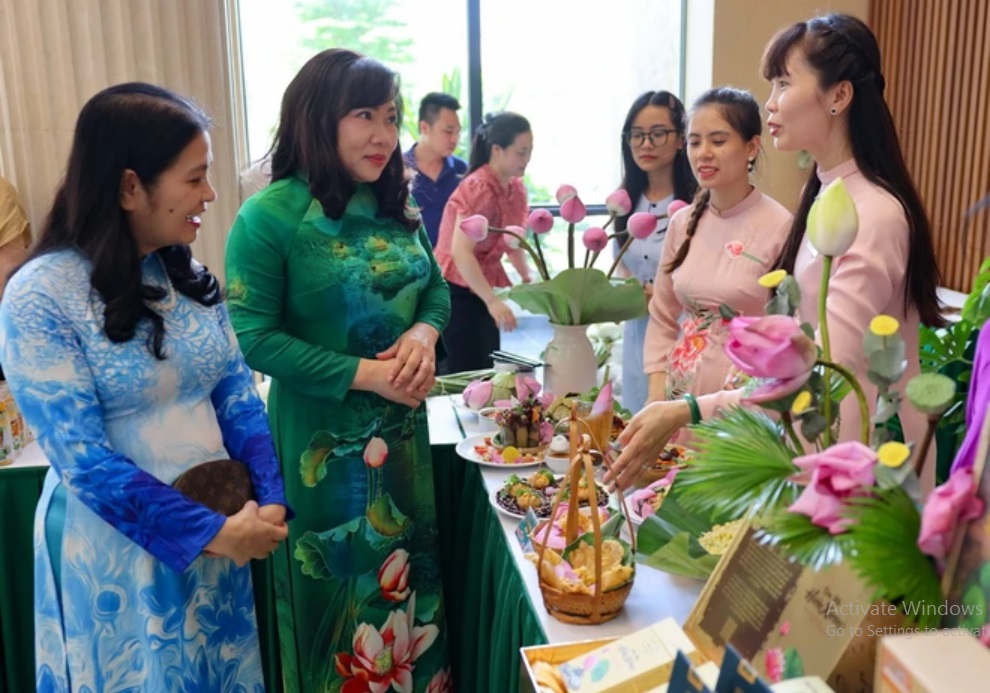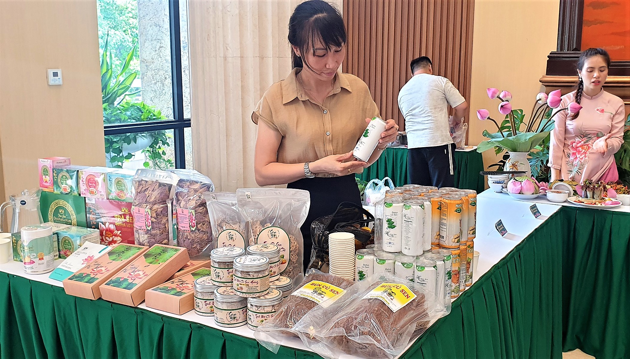 Đại biểu tìm hiểu về các sản phẩm từ sen được giới thiệu tại hội thảo.