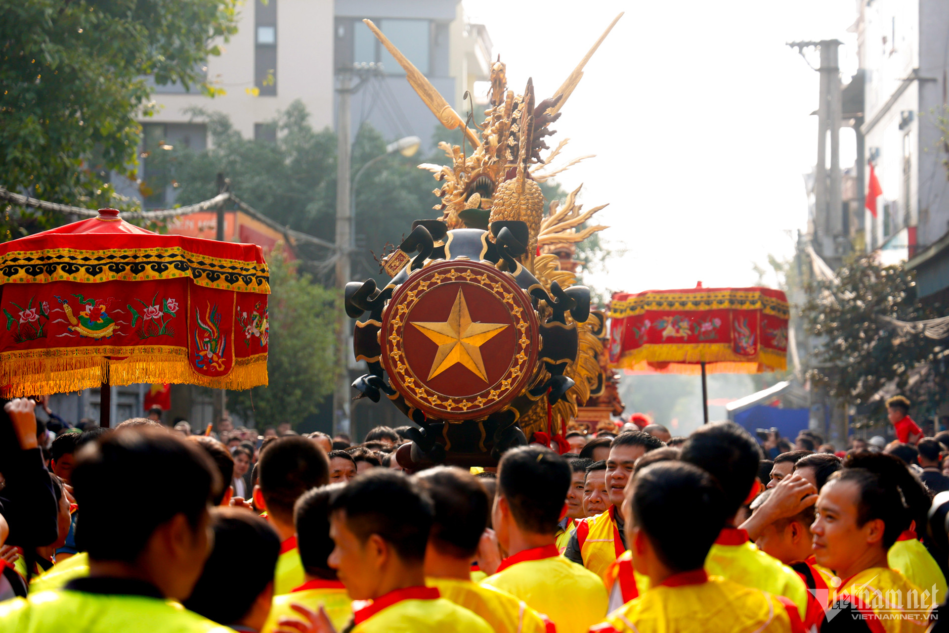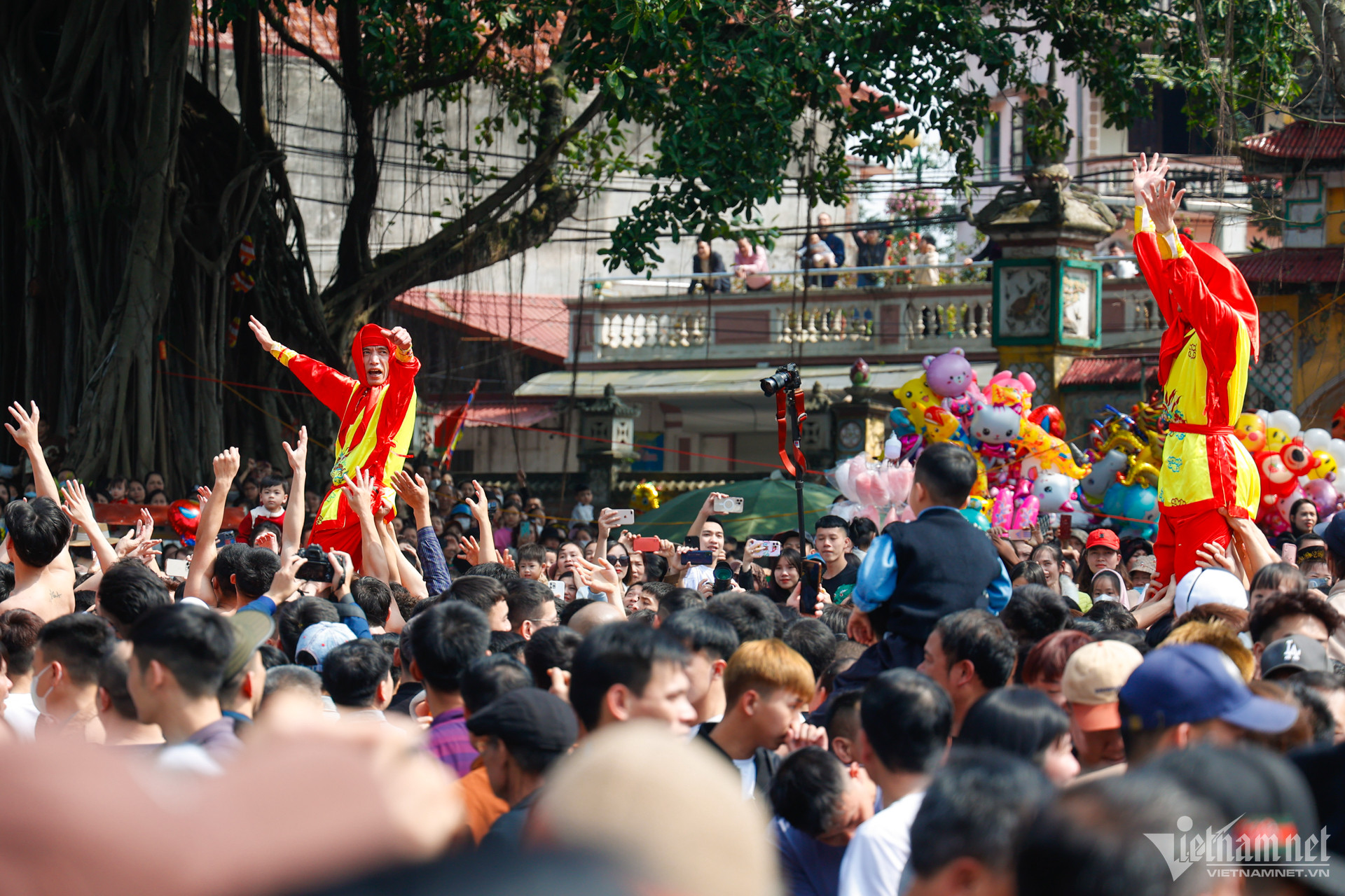 Sau khi rước 2 pháo khổng lồ quanh làng, 4 ông quan đám sẽ múa tại sân đình. 4 ông quan đám được các thanh niên cởi trần, mặc quần đùi tung hô trên cao. Ở dưới, các thanh niên chen lấn, xô đẩy chạy vòng quanh, vị quan đám nào được giữ đứng lâu nhất sẽ là người chiến thắng.