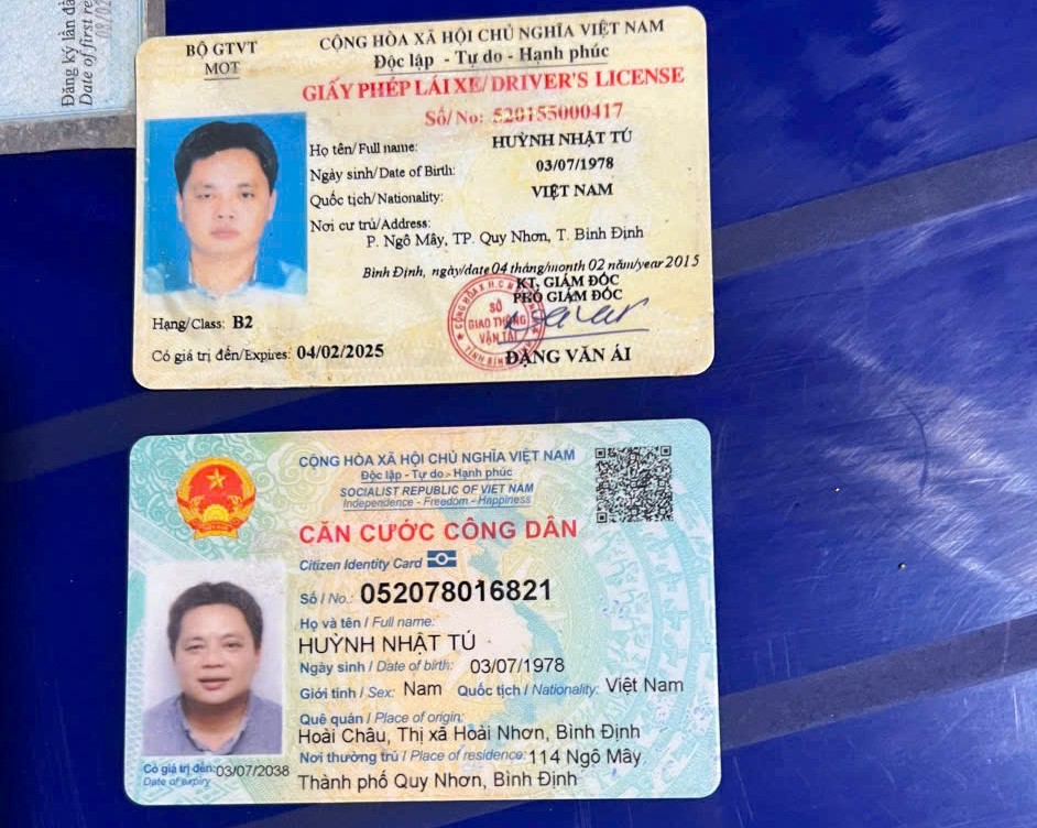 Sau khi bắt giữ, đối tượng khai là Huỳnh Nhật Tú (SN: 03/07/1978, trú tại: 114 Ngô Mây, TP. Quy Nhơn, tỉnh Bình Định) cùng 01 Căn cước công dân số: 052078016821 mang tên Huỳnh Nhật Tú, cấp ngày 28/06/2021, tại Cục CSQLHC về TTXH có giá trị đến ngày 03/07/2038, 01 Giấy phép lái xe hạng B2, số: 520155000417, mang tên Huỳnh Nhật Tú, cấp ngày 27/01/2015, tại Sở GTVT Bình Định, có giá trị đến ngày 04/02/2025.