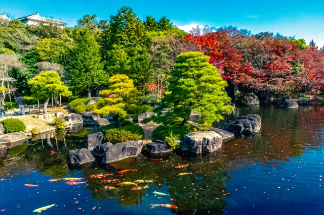 Cá koi đã được nuôi trong các ao bên trong nhiều khu vườn Nhật Bản. Tuy nhiên, vẻ đẹp quý phái của cá koi lại hòa quyện với vẻ sang trọng của khu vườn Nhật Bản, tạo nên một thế giới quan Nhật Bản duyên dáng. Ở một số khu vườn Nhật Bản, bạn có thể trải nghiệm cho cá koi ăn. Một số người trong số họ bán thức ăn cho cá koi.
