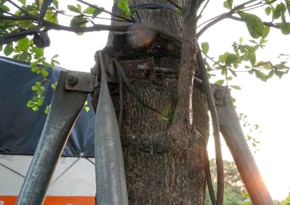 Không chỉ riêng hàng cây sao đen ở phố Lò Đức đang bị ‘bức tử’, nhiều cây xanh trồng tại các tuyến phố lớn ở Thủ đô cũng đang chịu chung số phận khi bị giá sắt siết chặt làm biến dạng thân, có cây bị đóng đinh, mắc đèn, treo đồ, ảnh hưởng đến sự phát triển.