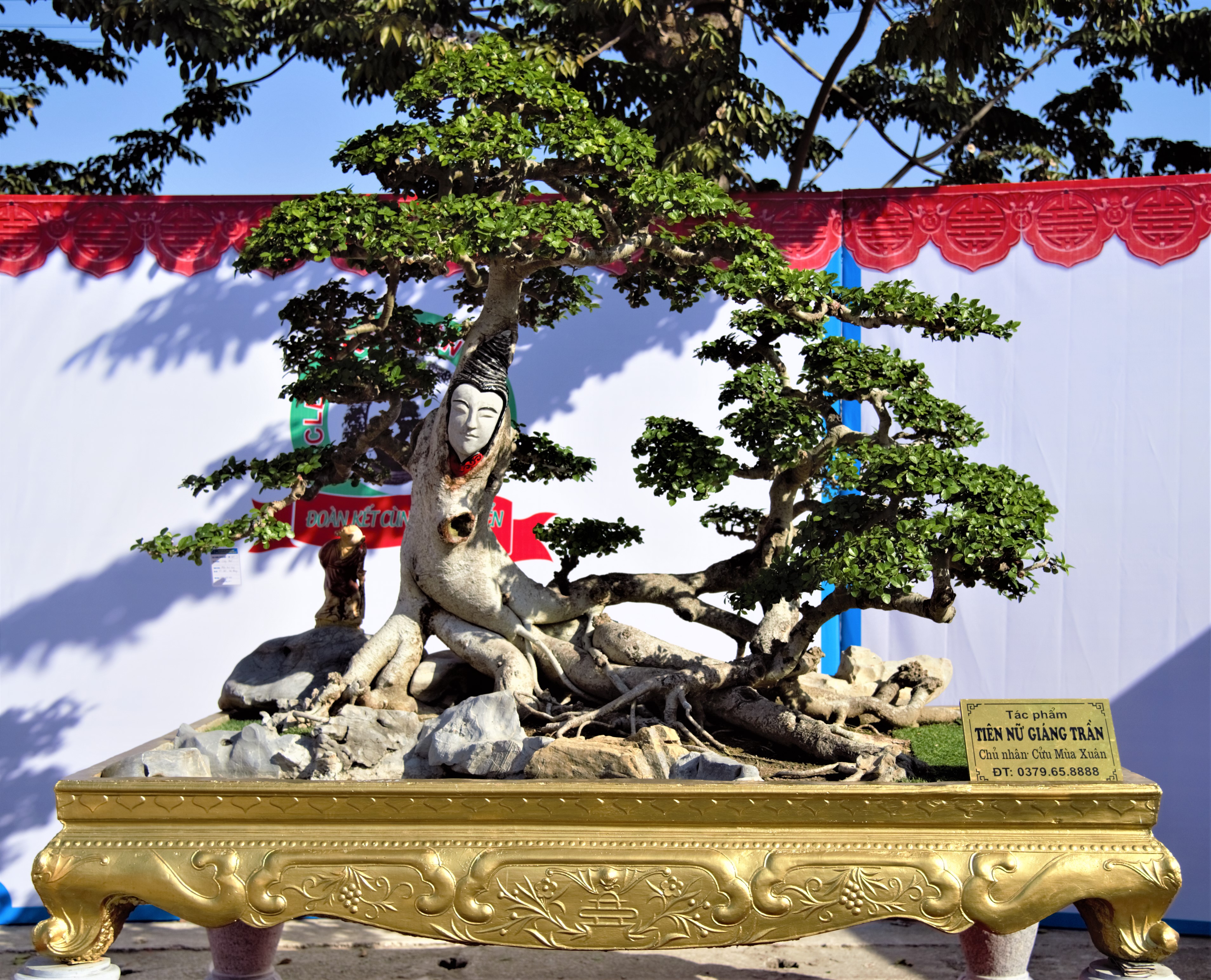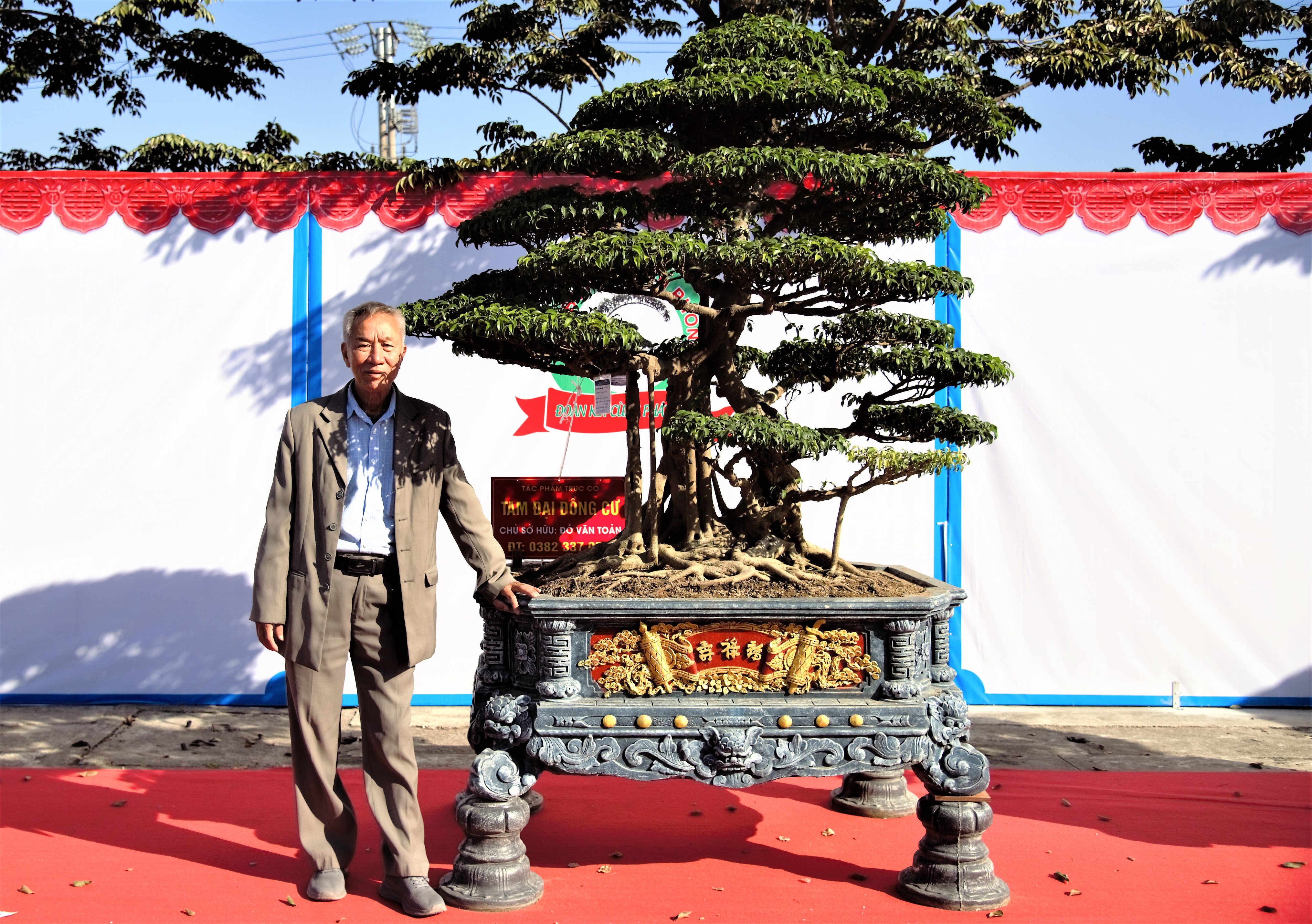 Ông Đỗ Văn Toản một trong những nhà vườn thuộc Hội SVC huyện Hiệp Hòa, tỉnh Bắc Giang bên tác phẩm Tam Đại Đồng Cư của mình tại triển lãm