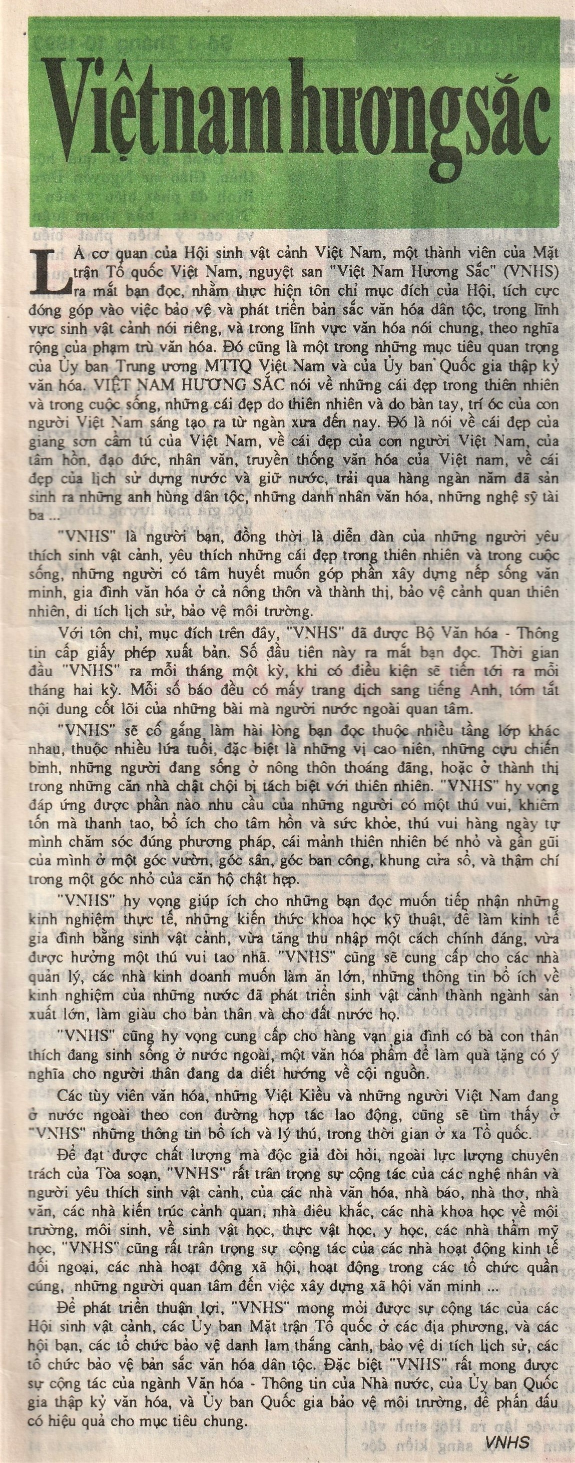 Ban Biên tập: Nhân dịp kỷ niệm 29 năm (1993-2022), Tạp chí Việt Nam Hương sắc ra số đầu, Ban Biên tập trân trọng giới thiệu cùng bạn đọc bài Xã luận là cương lĩnh, ngọn cờ hoạt động của Tạp chí trong suốt quá trình trưởng thành và phát triển. Từ đó đến nay, Tạp chí luôn đi đúng tôn chỉ mục đích của Hội Sinh vật cảnh Việt Nam, hướng tới khai thác và phản ánh cái hay, cái đặc sắc trong thiên nhiên và cuộc sống của con người; tâm hồn, đạo đức, nhân văn và truyền thống văn hóa tốt đẹp; ca ngợi lịch sử dựng nước và giữ nước trải qua hằng ngàn năm của dân tộc. Tạp chí Việt Nam Hương sắc còn là người bạn đồng hành, là diễn đàn của những người yêu thích sinh vật cảnh, hướng tới chân, thiện, mỹ, có tâm huyết xây dựng và bảo vệ môi trường sinh thái, di tích lịch sử, cảnh quan thiên nhiên gấm vóc của đất nước.
