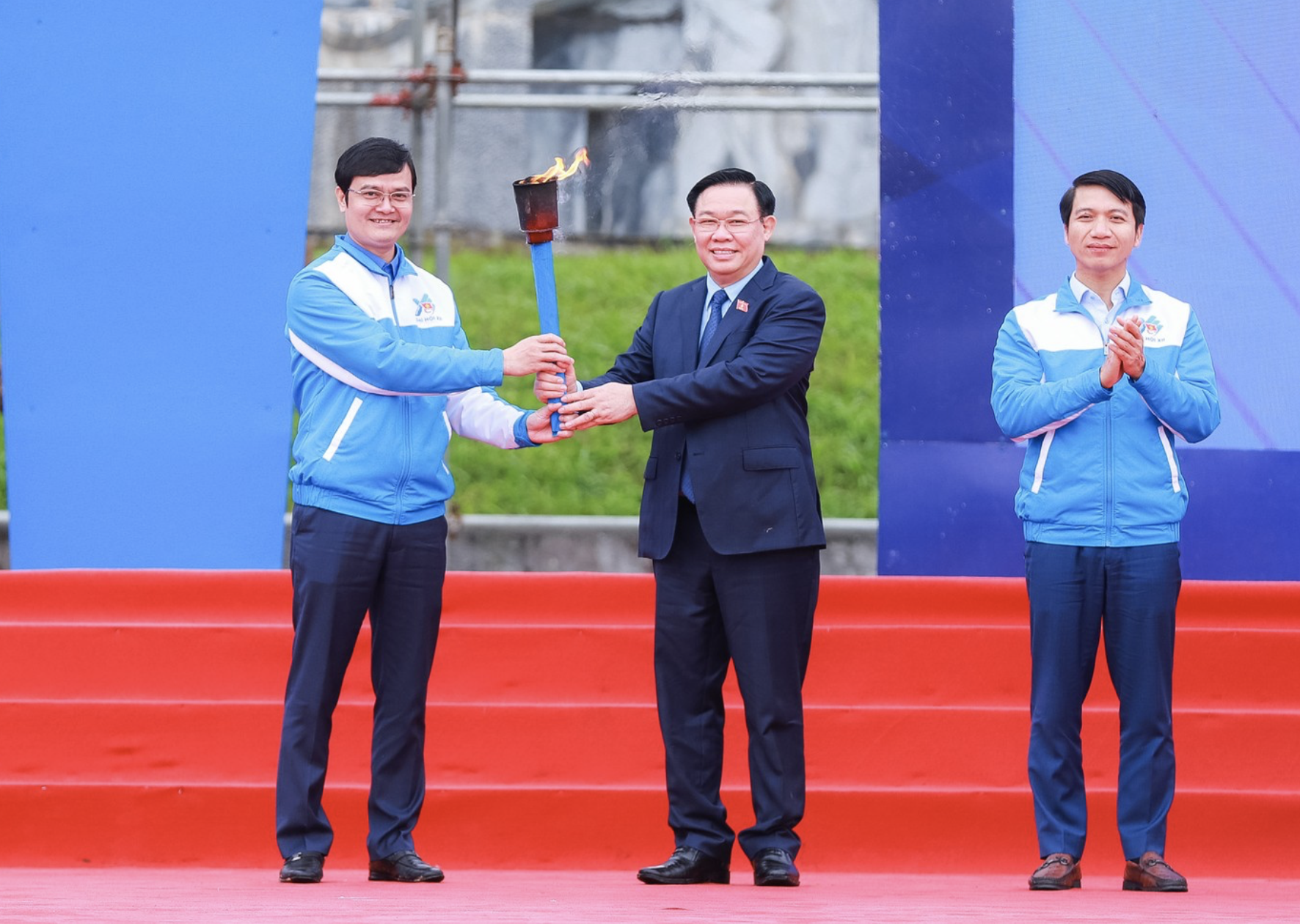 Chủ tịch Quốc hội Vương Đình Huệ trao ngọn đuốc được rước từ Khu Di tích Quốc gia đặc biệt Kim Liên, Nam Đàn đến đồng chí Đồng chí Bùi Quang Huy – Bí thư thứ nhất Ban Chấp hành Trung ương Đoàn TNCS Hồ Chí Minh để thắp lên ngọn lửa tình nguyện, chính thức khởi động Tháng Thanh niên năm 2024.