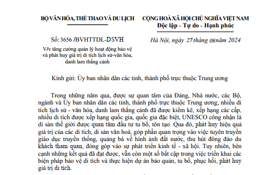 Ngày 27/8/2024, Bộ Văn hóa, Thể thao và Du lịch ban hành Công văn số 3656/BVHTTDL-DSVH về việc tăng cường quản lý hoạt động bảo vệ và phát huy giá trị di tích lịch sử - văn hóa, danh lam thắng cảnh.