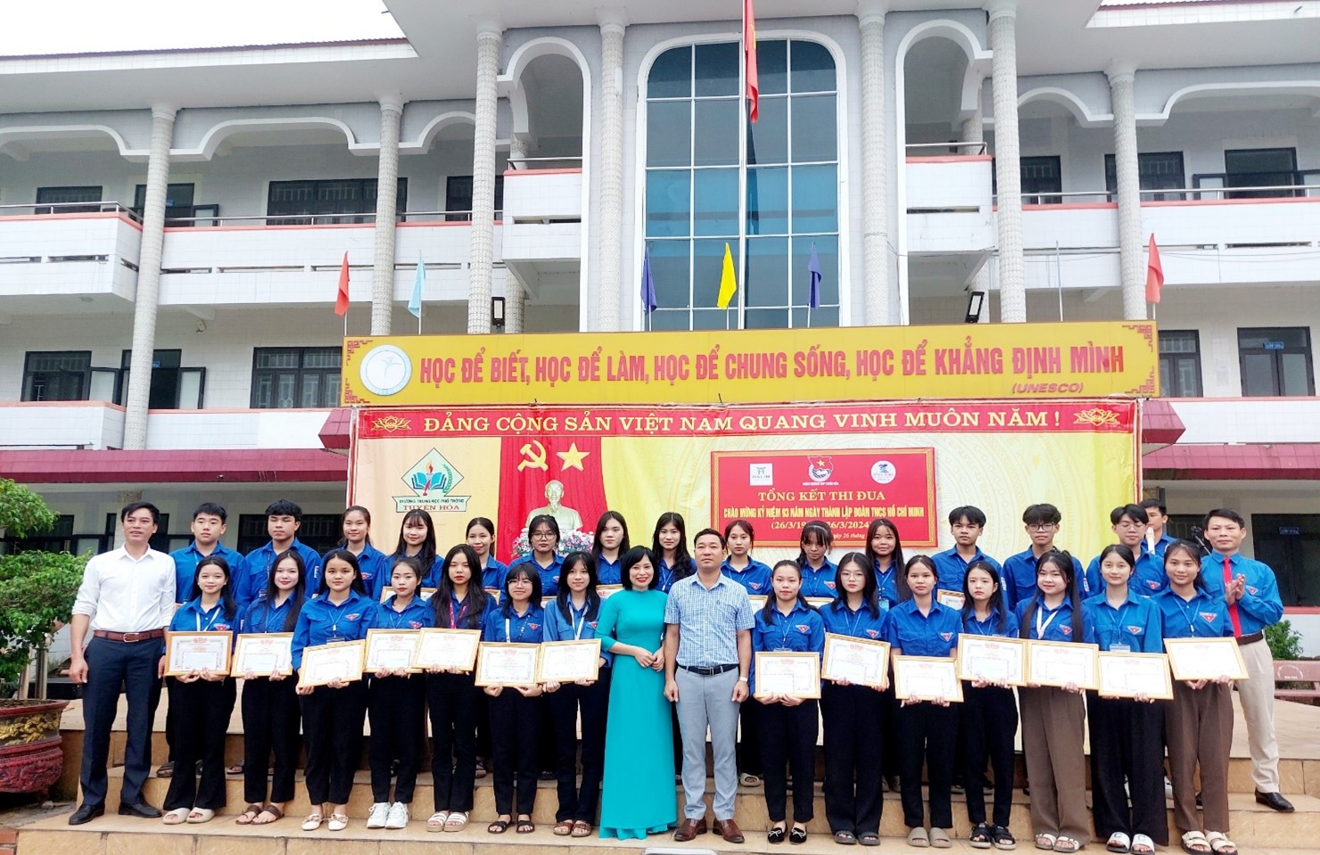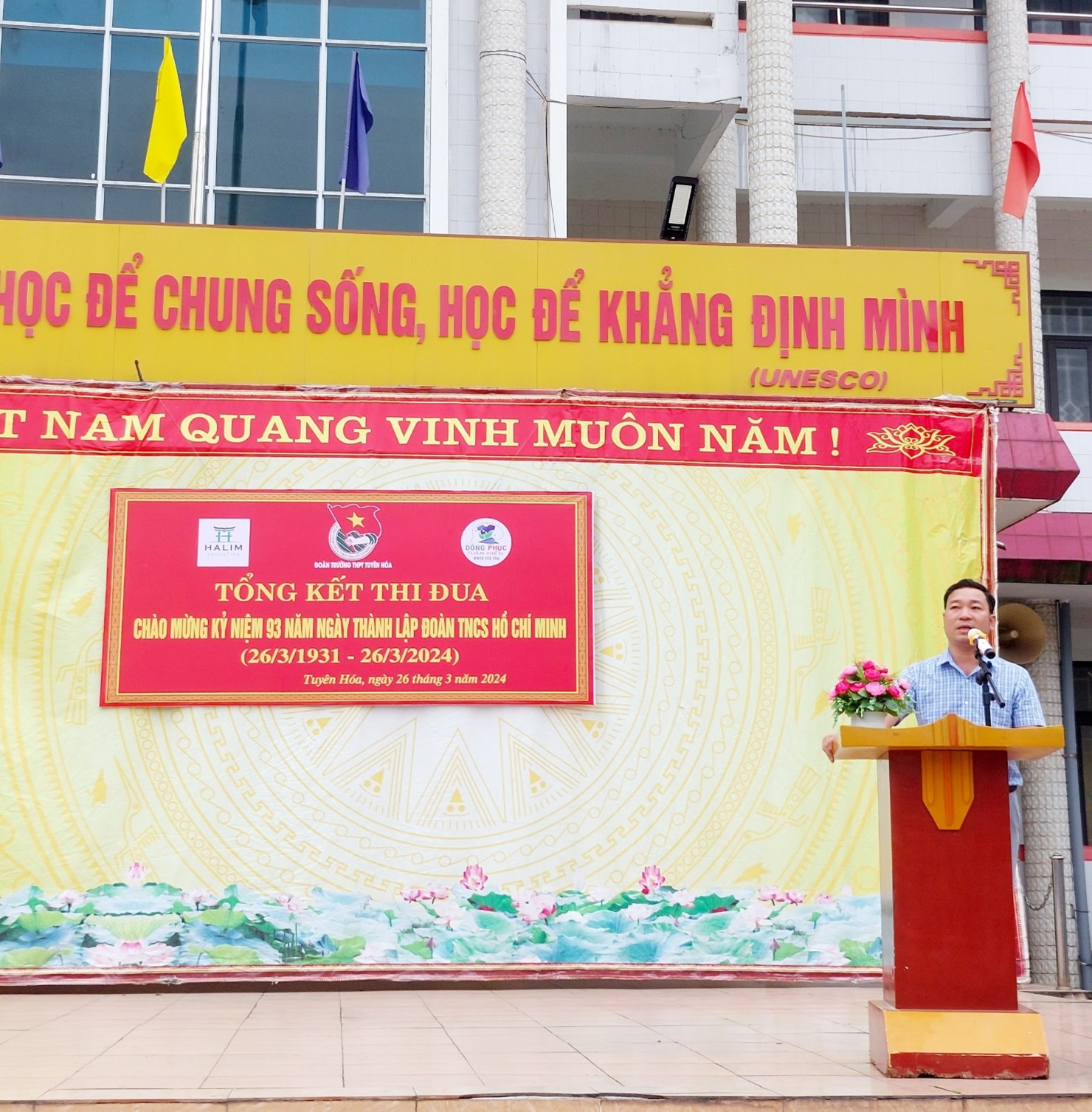 Hòa cùng với khí thế thi đua sôi nổi của tuổi trẻ cả nước kỉ niệm ngày thành lập Đoàn TNCS Hồ Chí Minh, sáng thứ Ba ngày 26/3/2024, Đoàn trường THPT Tuyên Hoá long trọng tổ chức lễ kỷ niệm 93 năm ngày thành lập đoàn TNCS Hồ Chí Minh (26/3/1931- 26/3/2024) nhằm ôn lại truyền thống lịch sử vẻ vang của Đoàn TNCS Hồ Chí Minh, tuổi trẻ Việt Nam và tuyên dương cán bộ Đoàn tiêu biểu cấp trường năm học 2023-2024. Buổi lễ có sự tham dự của các thầy cô giáo trong BGH nhà trường, BCH Đoàn trường, các giáo viên chủ nhiệm và ĐVTN, học sinh Nhà trường.