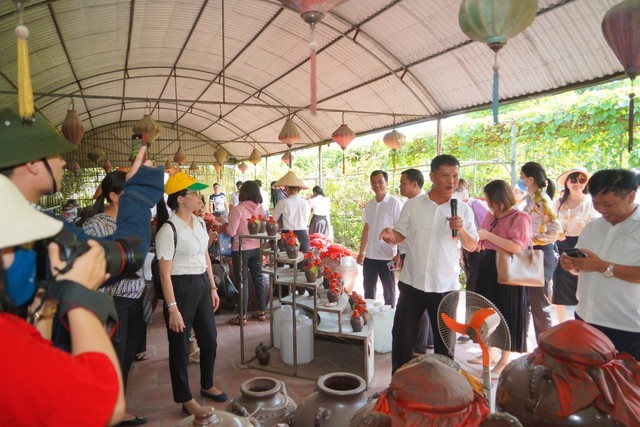 Du khách được giới thiệu mua sản phẩm làng nghề tại xã Hồng Vân.