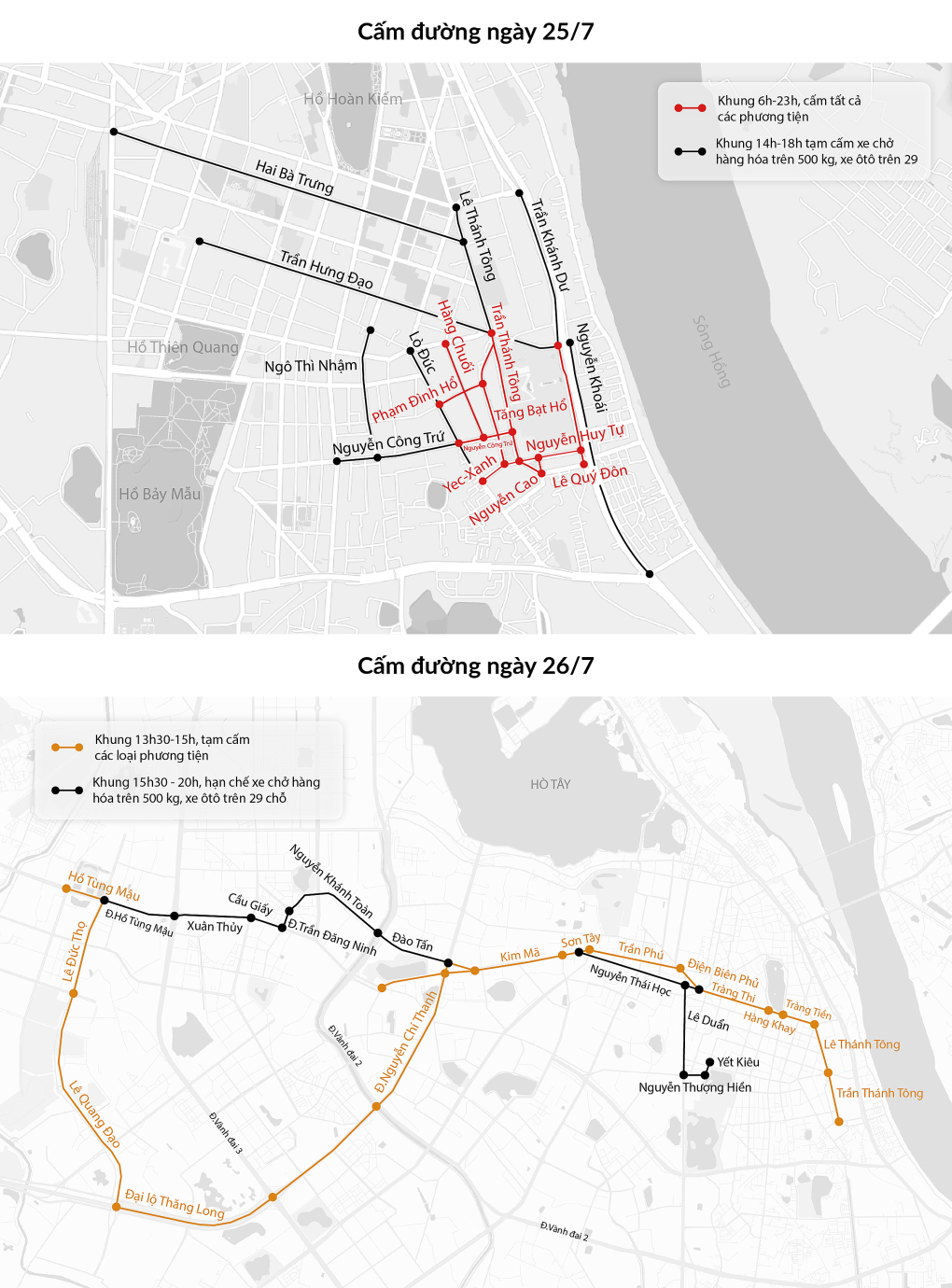 Từ 15h30 đến 20h ngày 26/7, hạn chế các xe ô tô chở hàng có khối lượng hàng hóa chuyên chở từ 500 kg trở lên, xe ô tô chở khách từ 29 chỗ trở lên (trừ xe buýt, xe thu gom rác, xe giải quyết sự cố, xe có phù hiệu bảo vệ, xe phục vụ Quốc tang) hoạt động trên một số tuyến đường: Hồ Tùng Mậu (đoạn từ Nguyễn Cơ Thạch đến Phạm Hùng), Xuân Thủy, Cầu Giấy (đoạn từ Trần Thái Tông đến Trần Đăng Ninh), Trần Đăng Ninh (đoạn từ Cầu Giấy đến Nguyễn Khánh Toàn), Nguyễn Khánh Toàn, Đào Tấn, Kim Mã, Nguyễn Thái Học, Lê Duẩn (đoạn từ Nguyễn Thái Học đến Nguyễn Thượng Hiền), Nguyễn Thượng Hiền, Yết Kiêu (đoạn từ Nguyễn Thượng Hiền đến Thiền Quang), Thiền Quang.