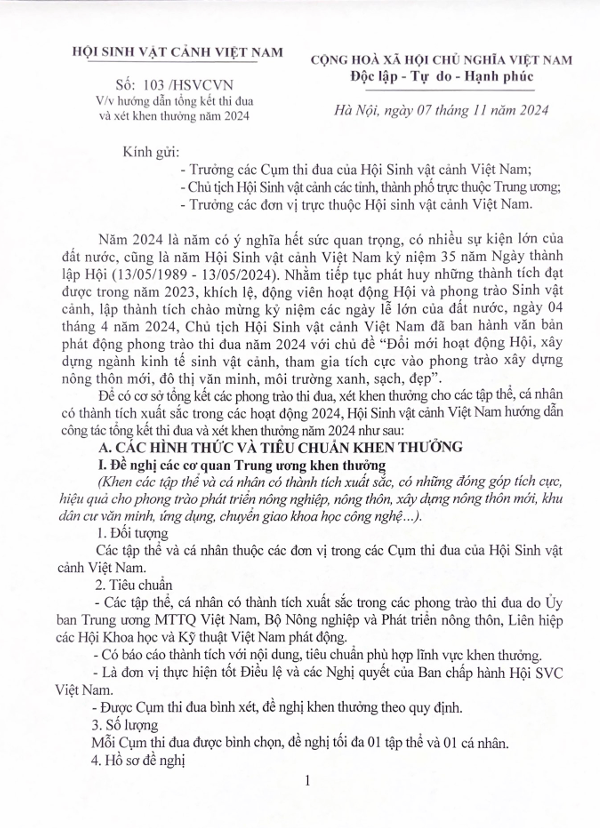 Để có cơ sở tổng kết các phong trào thi đua, xét khen thưởng cho các tập thể, cá nhân có thành tích xuất sắc trong các hoạt động 2024, Hội Sinh vật cảnh Việt Nam hướng dẫn công tác tổng kết thi đua và xét khen thưởng năm 2024. Cụ thể như sau: