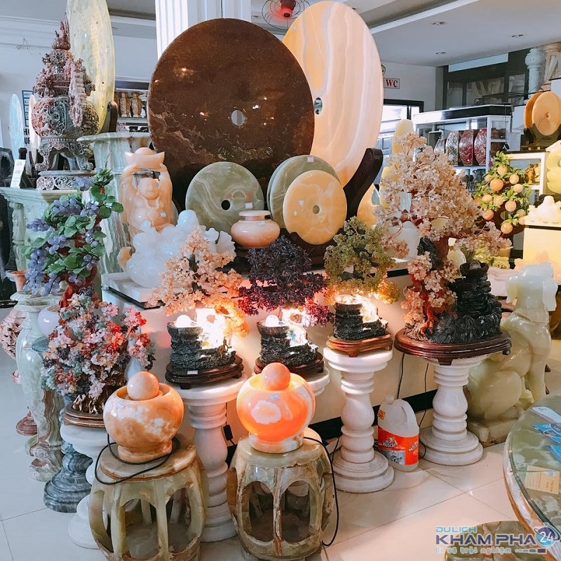 Sản phẩm của làng nghề hết sức đa dạng và phong phú. Từ những đồ dùng thông dụng, thô sơ của cuộc sống đời thường như cái chày, cái cối, … đến những đồ trang sức nhỏ gọn, tinh xảo, đủ các màu sắc như những chiếc vòng, chiếc nhẫn, chuỗi hạt, những con cóc chặn giấy, những cặp sư tử hí cầu, những con đại bàng sải rộng cánh, những cặp cá thần tiên bằng đá cẩm thạch hồng hoặc thủy mặc, .v.v… Bên cạnh đó, du khách khi đến làng nghề còn được chiêm ngưỡng những pho tượng đá cực kỳ ấn tượng như tượng phật bà Quan Âm, tượng Nữ thần Chămpa….