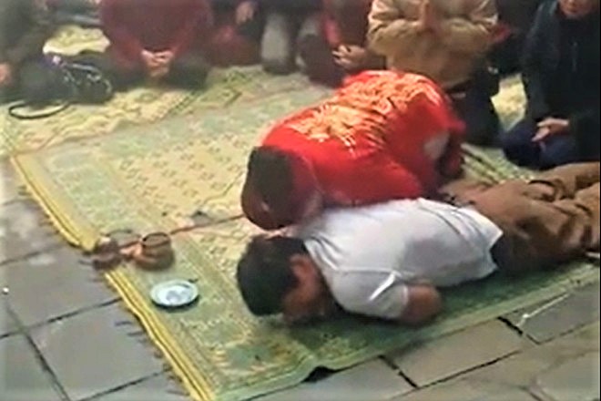 Hình ảnh người phụ nữ được cho là “ lên đồng” đang cắn liên tục lên áo của một số người