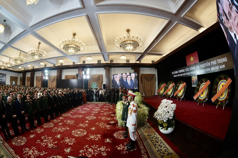 Các đồng chí lãnh đạo, nguyên lãnh đạo Đảng, Nhà nước, Mặt trận Tổ quốc Việt Nam đã đi vòng quanh linh cữu, xúc động vĩnh biệt Tổng Bí thư Nguyễn Phú Trọng - Nhà lãnh đạo đặc biệt xuất sắc, một tấm gương sáng ngời về học tập, làm theo tư tưởng, đạo đức, phong cách Hồ Chí Minh, người đảng viên cộng sản kiên trung, có uy tín lớn của Đảng, Nhà nước và nhân dân ta, hiện thân đầy đủ phẩm chất, tài năng, bản lĩnh, trí tuệ của thế hệ lãnh đạo Việt Nam thời kỳ đổi mới.