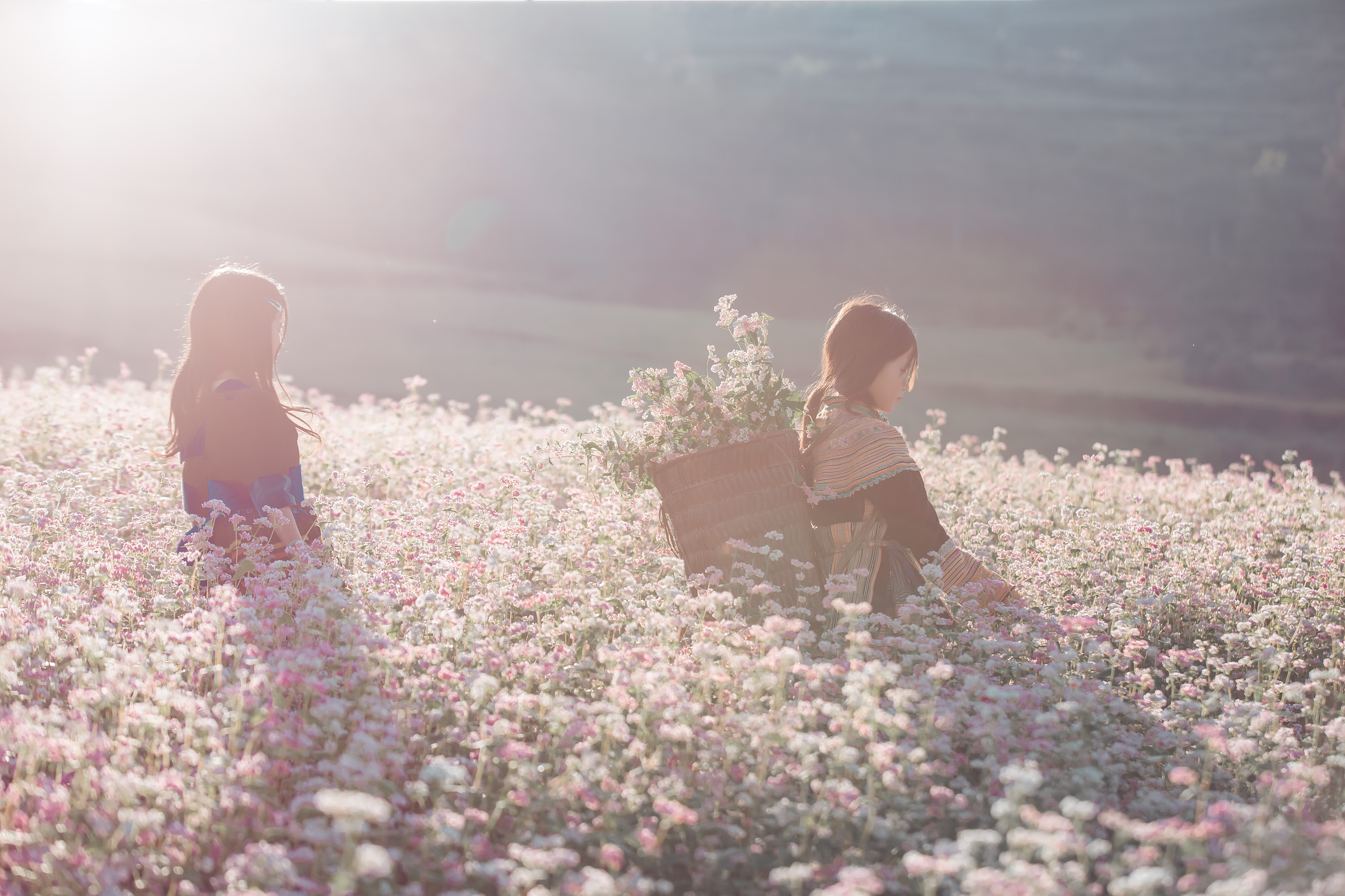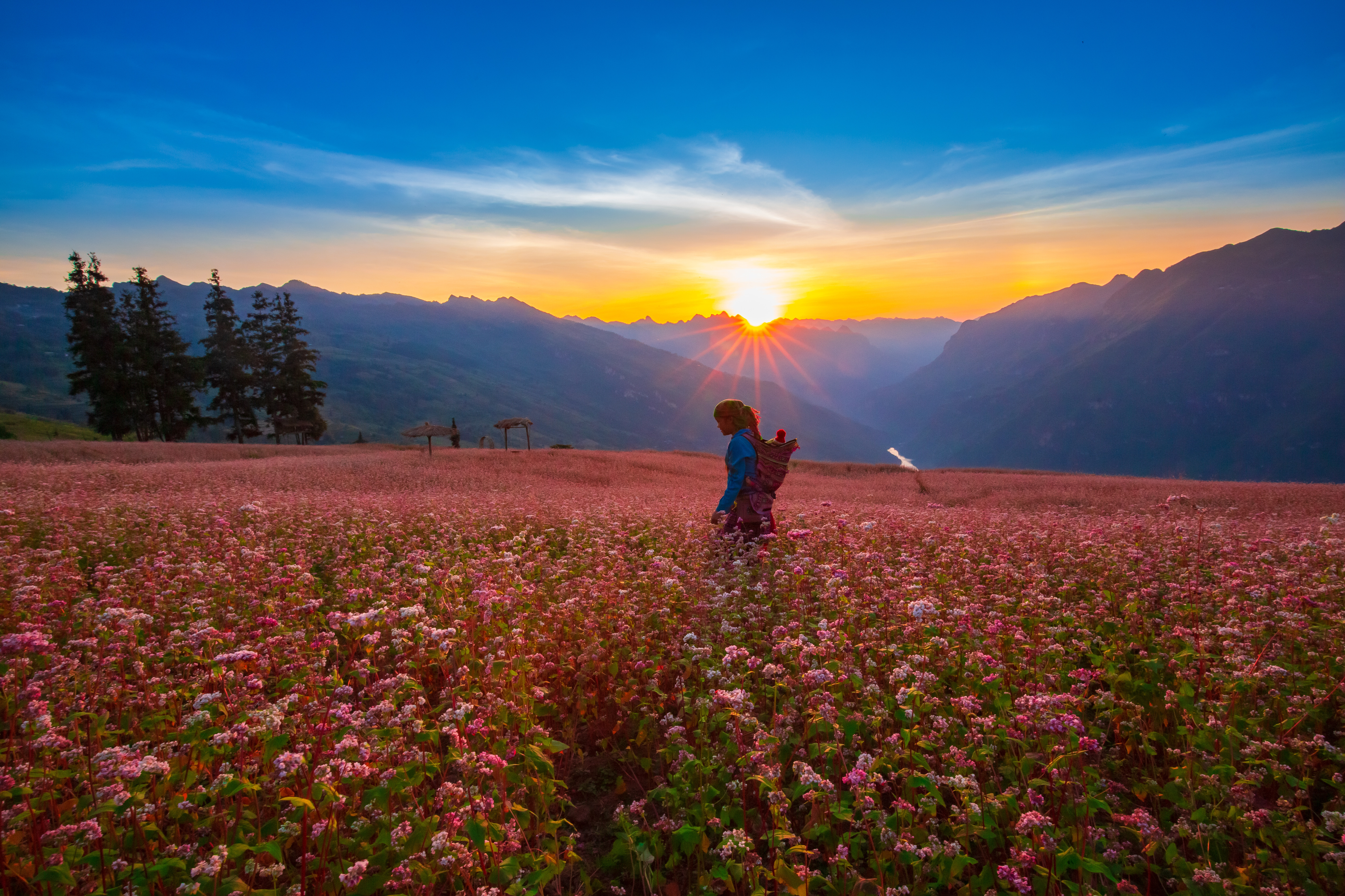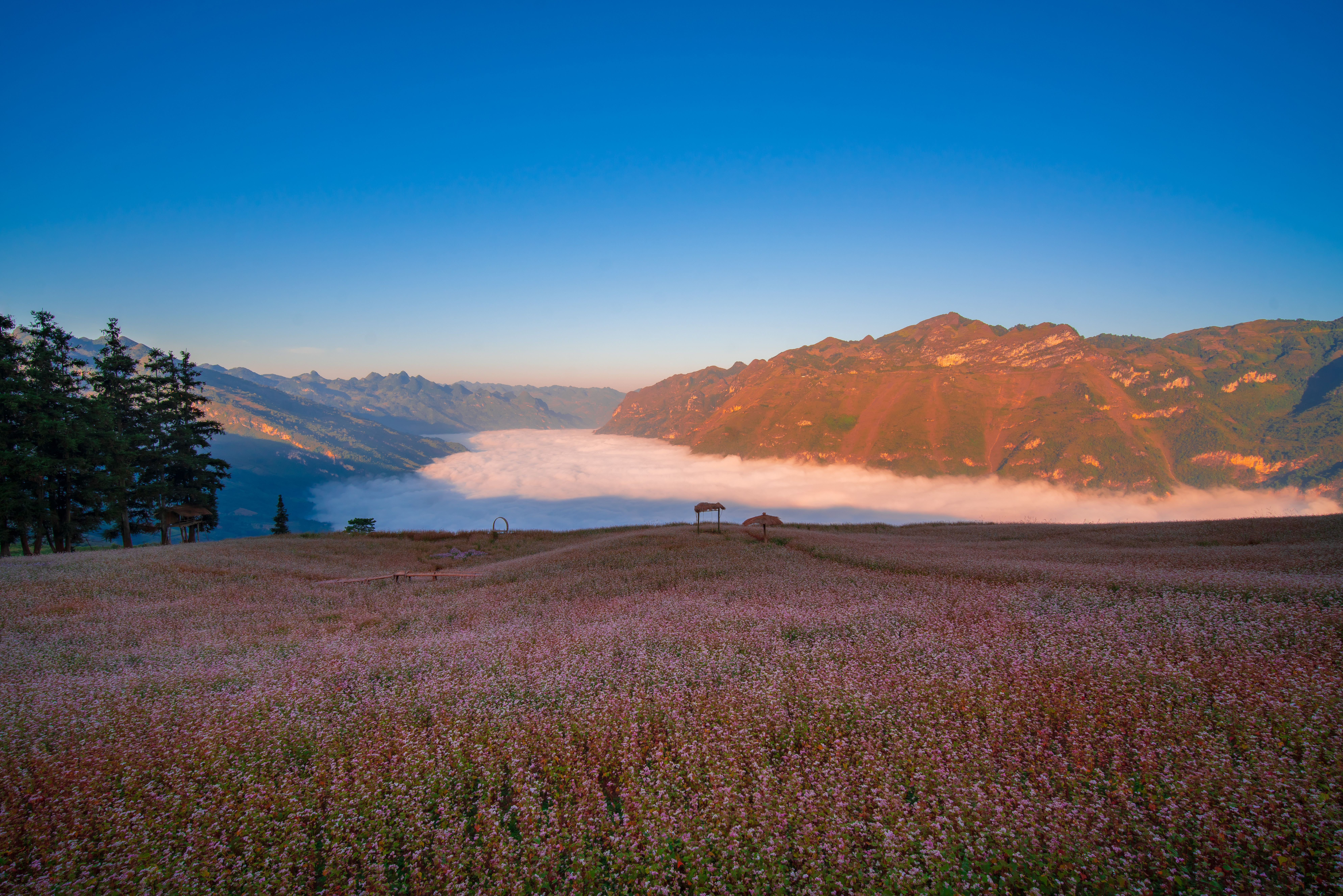Thời gian gần đây, thảo nguyên Suôi Thầu (Hà Giang) đang là điểm đến thu hút du khách mê xê dịch với khung cảnh nên thơ, được ví von như "thảo nguyên Thụy Sĩ giữa lòng Hà Giang". Nơi đây nằm cách thị trấn Cốc Pài, huyện Xín Mần, tỉnh Hà Giang khoảng 5 km và ở độ cao trên 1.200 m so với mặt nước biển, mang vẻ đẹp hoang sơ, mộc mạc nhưng không kém phần hùng vĩ (Ảnh: Hoàng Dưỡng)Những ngày đầu tháng 11, Suôi Thầu càng trở nên mộng mơ với sự xuất hiện của cánh đồng tam giác mạch trải rộng, đang đồng loạt nở hoa (Ảnh: Hoàng Dưỡng)Bộ ảnh được nhiếp ảnh gia Hoàng Dưỡng (Hà Nội) chụp vào đầu tháng 11/2022. Thời điểm này, hoa tam giác mạch đã chuyển sang màu phớt hồng, rực rỡ trên thảo nguyên xanh mênh mông. Loài hoa này đổi màu theo thời điểm trong ngày, đặc biệt, khi thời tiết lạnh, hoa càng thắm màu và đẹp (Ảnh: Hoàng Dưỡng)