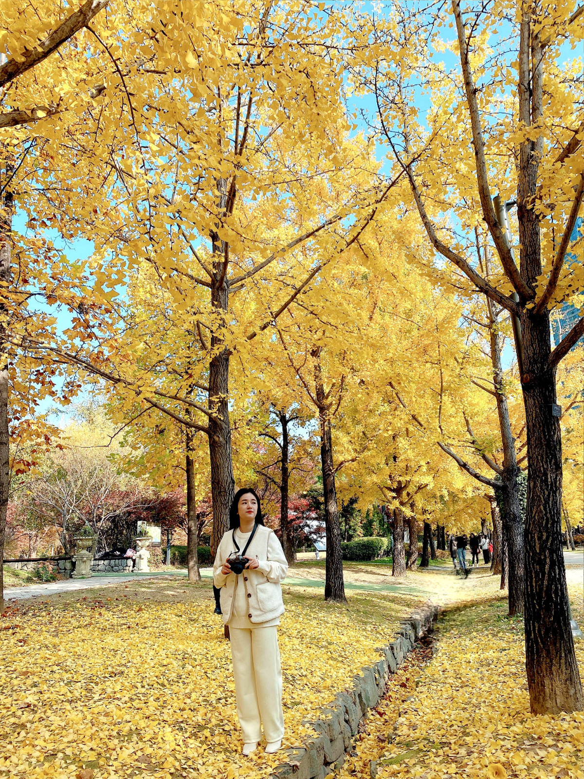Nữ du khách Việt Đoàn Thùy Linh chụp ảnh lá vàng tại công viên Rừng Seoul (Seoul Forest Park) ngày 1/11. Đây là một trong những công viên nổi tiếng nhất tại Hàn, nằm giữa lòng thủ đô Seoul ở địa chỉ 273, Ttukseom-ro, Seongdong-gu. Nơi đây chỉ cách ga Seoul Forest khoảng 5 phút đi bộ. Ảnh: Đoàn Thùy Linh