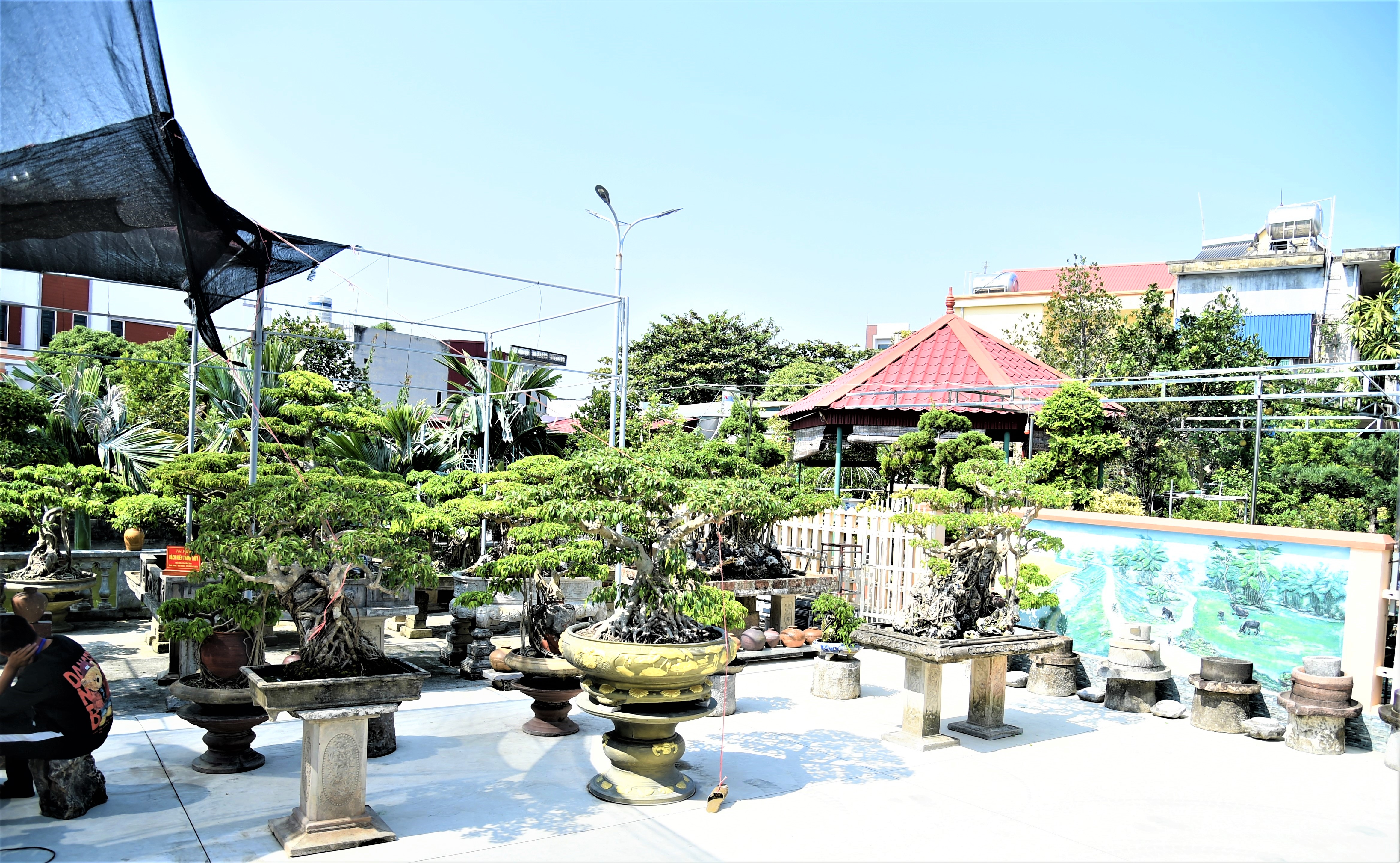 Đón tiếp chúng tôi tại khuôn viên của gia đình, hình ảnh gây ấn tượng phóng viên đó là khu vườn với hàng trăm cây cảnh với các dáng thế khác nhau, có những tác phẩm đã hoàn thiện và những tác phẩm còn đang trong quá trình tạo tác.
