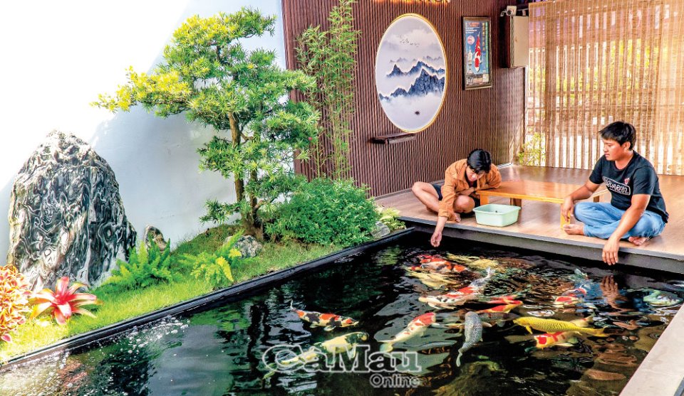Những hòn đá cùng với cây cảnh bonsai là điểm nhấn cho hồ cá koi thêm phần đa sắc.