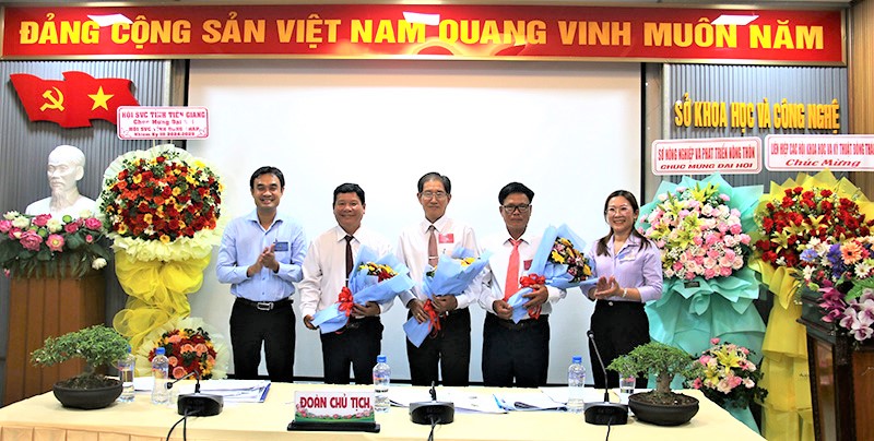 Đại diện lãnh đạo Sở Nông nghiệp và Phát triển nông thôn tỉnh Đồng Tháp và Sở Nội vụ tỉnh tặng hoa cho Chủ tịch và Phó Chủ tịch Hội Sinh vật cảnh tỉnh Đồng Tháp, nhiệm kỳ 2024 - 2029