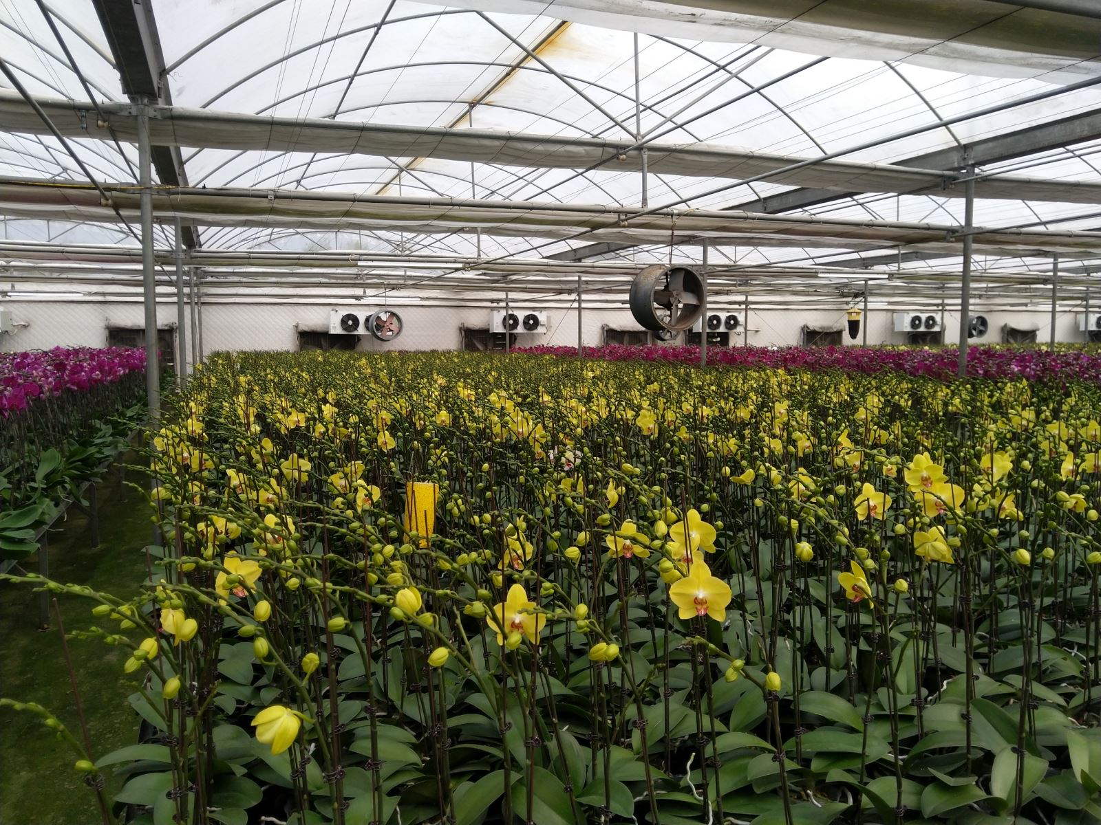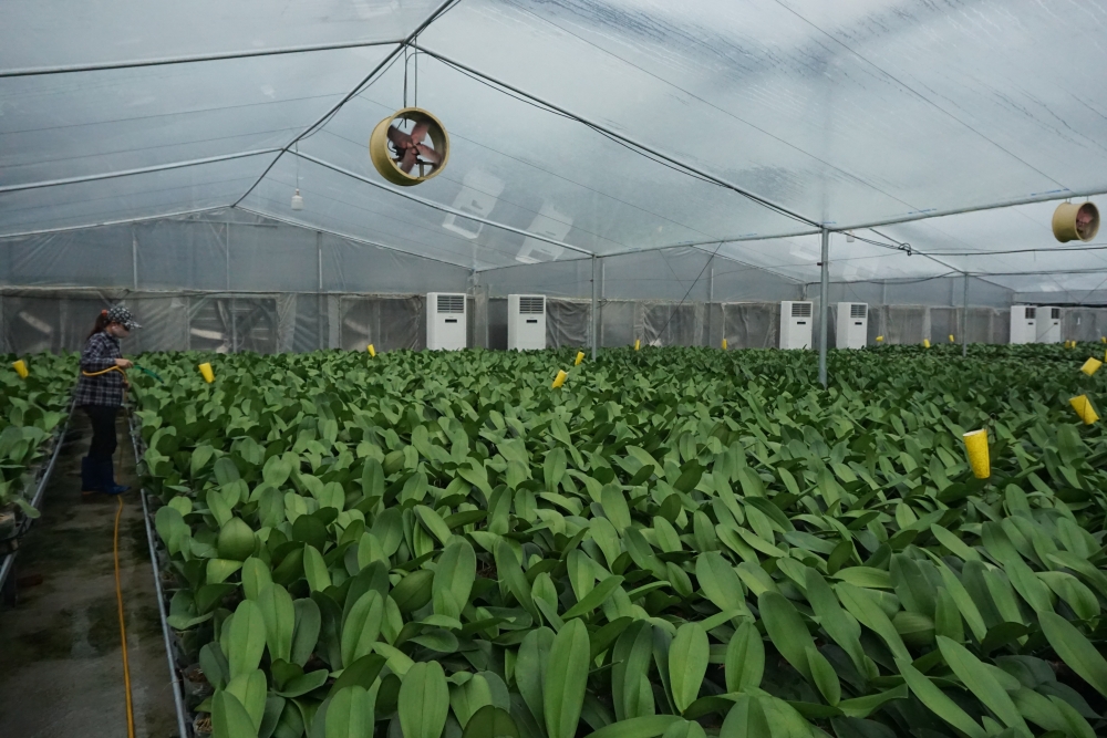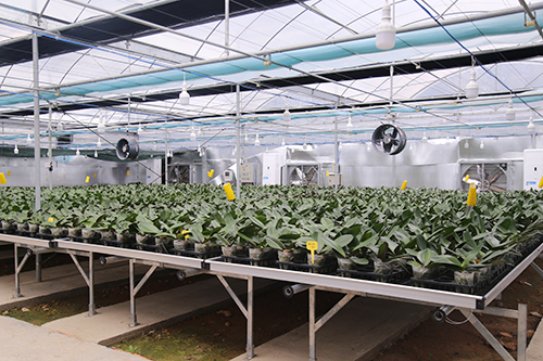 Khi sản xuất hoa lan Hồ điệp theo quy mô công nghiệp cần có biện pháp sắp xếp chiều cao mầm hoa theo thứ tự tăng dần theo chiều dài nhà lưới (mầm hoa thấp để gần quạt hút gió và chiều cao mầm tăng dần về phía tấm làm mát) để khi thu hoạch sẽ cho sản phẩm hoa lan nở đồng đều nhau.