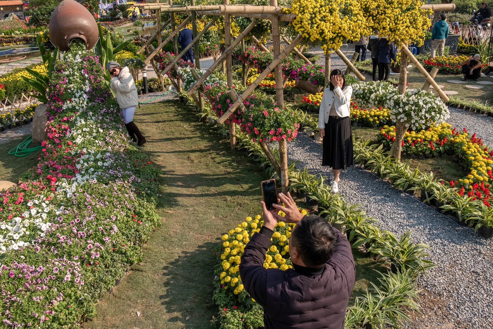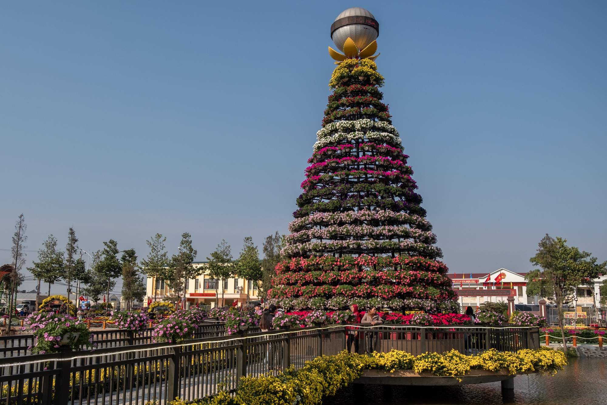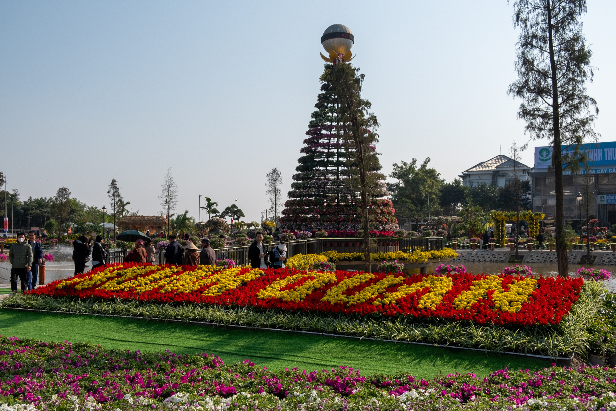 Điểm nhấn ở lễ hội hoa năm nay là tháp hoa xuân với chiều cao khoảng 13m được trang trí bằng 500 chậu hoa dạ yến thảo.