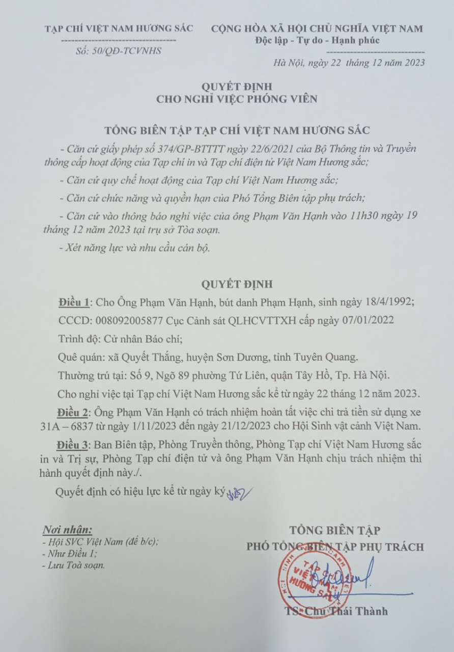 Ban biên tập Tạp chí Việt Nam Hương sắc, cơ quan của Hội Sinh vật cảnh Việt nam thông báo về việc chám dứt hoạt động hợp tác báo chí đối với ông Phạm Văn Hạnh (bút danh Phạm Hạnh),sinh ngày 18/04/1992 tại Tuyên Quang, CCCD số 008092005877 do Cục Cảnh sát quản lý hành chính về trật tự xã hội cấp ngày 07/01/2022.