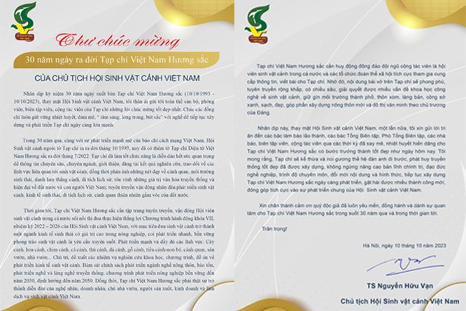 Nhân dịp kỷ niệm 30 năm ngày xuất bản Tạp chí Việt Nam Hương sắc (10/10/1993 - 10/10/2023), thay mặt Hội Sinh vật cảnh Việt Nam, tôi thân ái gửi tới toàn thể cán bộ, phóng viên, biên tập viên, cộng tác viên của Tạp chí những lời chúc mừng tốt đẹp nhất. Chúc các đồng chí luôn giữ vững nhiệt huyết, đam mê, “ tâm sáng, lòng trong, bút sắc” với nghề để tiếp tục xây dựng và phát triển Tạp chí ngày càng lớn mạnh.