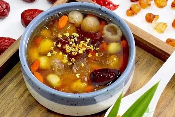 Bài thuốc gồm có các nguyên liệu sau 10g nấm tuyết, 100g gạo tẻ, 50g đường phèn, 20 quả đại táo. Nấm tuyết sơ chế đem đi rửa sạch, cắt bỏ phần chân nấm, đại táo bỏ phần hạt. Sau đó ngân nhĩ và đại táo ninh với gạo thành cháo, bổ sung thêm đường phèn. Chia hỗn hợp cháo thành vài lần ăn trong ngày.