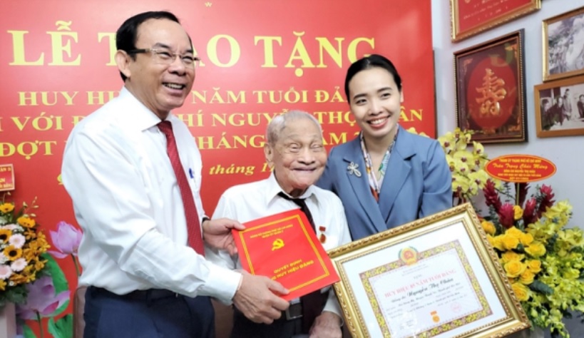 Bí thư Thành ủy TP Hồ Chí Minh Nguyễn Văn Nên trao Huy hiệu 85 năm tuổi Đảng cho đồng chí Nguyễn Thọ Chân.